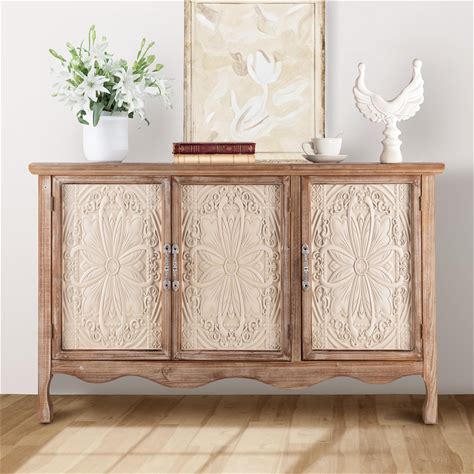 Fansafurn Accent Storage Cabinet With 3 Carved Doors And Shelves, Farmhouse Sideboard Buffet Sideboard With Storage, Wood Kitchen Cabinet For Living