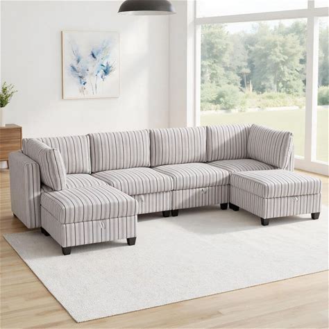 Unity 128 in. 6-Piece Polyester Blend Modular Convertible Sectional Sofa In. Blue+White Stripes With Storage, 2 Ottomans
